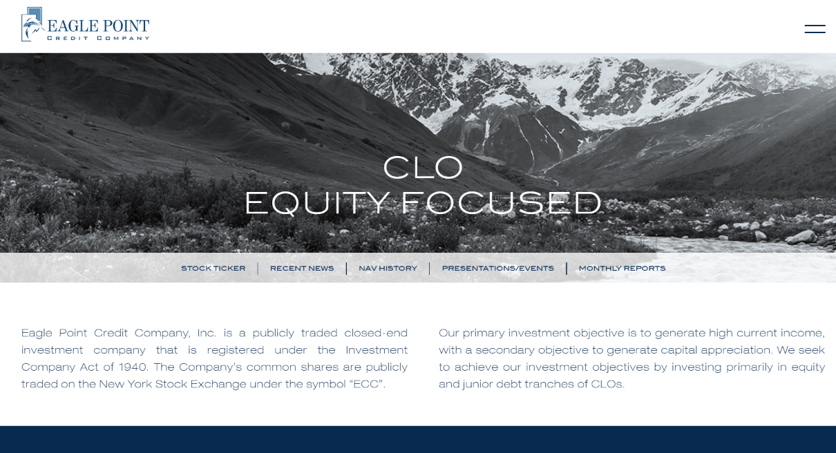 The fund is managed by Eagle Point Credit Management LLC (founded 2012 by Thomas Majewski and Stone Point Capital; approximately $13B AUM as of June 2025). The investment strategy is described as a 'private equity–style' approach to CLO equity investing—actively sourcing opportunities, taking meaningful positions, negotiating structural terms, and emphasizing CLO manager selection and deal economics rather than passive exposure. Per company materials, the primary objective is high current income with capital appreciation as a secondary objective, achieved through exposure to below-investment-grade CLO tranches backed by portfolios of senior secured loans. Recent performance as of Q3 2025 includes NAV of $7.00 per share (down 17% year over year from $8.44), a monthly distribution of $0.14 per share (approximately 24% annualized based on NAV), and a weighted average expected yield on the CLO equity portfolio of 18.28%, down from 21.21% the prior year. Fund scale includes total assets of more than $1.3B as of November 2024, exposure to 1,893 unique underlying loan obligors across 43 CLO managers, and a weighted average reinvestment period of 3.4 years. Leverage totaled 41.8% of total assets via debt and preferred stock as of September 2025. Shares trade publicly on the NYSE as common stock (ECC), alongside multiple series of preferred and term preferred securities with varying yields and seniority. Historical context is critical to total return analysis: the fund IPO’d in 2014 at $20 per share and paid cumulative distributions of $23.17 per share through September 2025, exceeding the original IPO price, while NAV declined from a peak of $11.18 in December 2020 to $7.00 by September 2025, representing approximately 37% erosion. As a result, investor outcomes are highly dependent on entry point, distribution capture, and the interaction between NAV changes and market price premiums or discounts. The market backdrop includes growth of the U.S. CLO market to approximately $1.15 trillion outstanding by 2025 from roughly $600B in 2018, representing about 11% CAGR, and a leveraged loan market that has generated positive calendar-year returns in 30 of the past 33 years per company-cited data, though performance remains cyclical and sensitive to credit conditions. The risk profile reflects characteristics typical of CLO equity–focused closed-end funds: shares may trade at material premiums or discounts to NAV, CLO equity occupies the first-loss position in the capital structure, leverage materially amplifies volatility, underlying CLO equity positions are illiquid and valued using quarterly fair value estimates, and extreme drawdown potential was demonstrated by an approximate 70% peak-to-trough decline during March 2020. The fund is registered under the Investment Company Act of 1940 and structured as a regulated investment company (RIC), subject to SEC reporting, board oversight, and distribution requirements. Peer comparisons include other CLO-focused closed-end funds such as Oxford Lane Capital (OXLC), Eagle Point Income Company (EIC, a sister fund focused on CLO debt rather than equity), and OFS Credit Company (OCCI). The fund is suitable for income-focused investors with high risk tolerance who understand CLO mechanics, leverage, and NAV volatility and are willing to trade capital stability for elevated current distributions and public-market liquidity. It is not suitable for investors requiring capital preservation or stable NAVs, those uncomfortable with extreme drawdowns, investors prioritizing total return or capital appreciation over income, or those unable to evaluate distribution sustainability, premium and discount dynamics, or fair value estimates.
