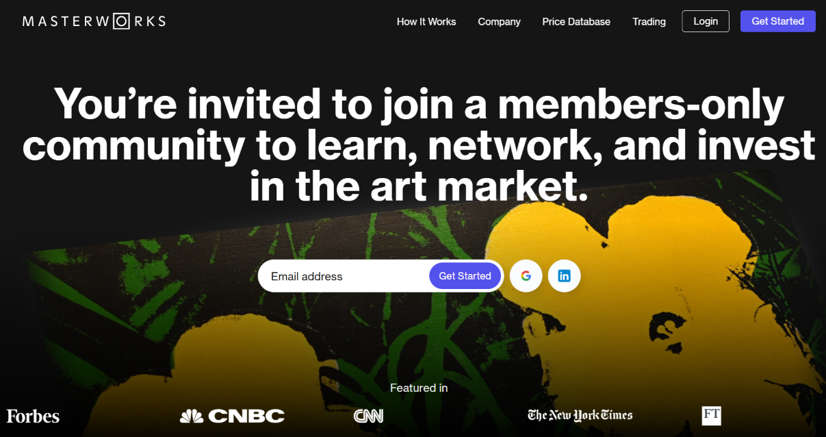 Fractional ownership platform for blue-chip contemporary art enabling investors to buy SEC-qualified shares ($20/share; platform-stated $15,000 minimums with reported flexibility during onboarding) in multi-million dollar works by artists like Banksy, Basquiat, and Warhol, with 3–10 year holds and 23 profitable exits to date (platform disclosed).