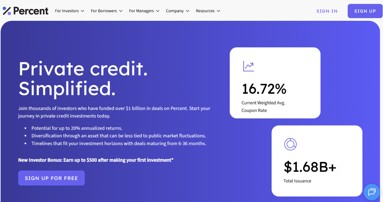 Percent democratizes institutional private credit through registered broker-dealer platform (FINRA member since August 2023) connecting accredited investors with short-duration alternative lending opportunities (6-36 months, 9-month average) across asset-based financing, consumer credit, and specialty deals. Platform's $500 marketplace minimum dramatically lowers entry barriers vs. traditional funds ($100K-$5M minimums) while broker-dealer registration provides regulatory oversight and investor protections unavailable through unregistered peer-to-peer platforms. Strong historical performance ($2B+ funded, 681 repaid deals, 14.47% average coupon, 3% default rate, 2.22% charge-off rate) and monthly distributions create compelling value proposition for accredited investors seeking public market diversification and current income generation.