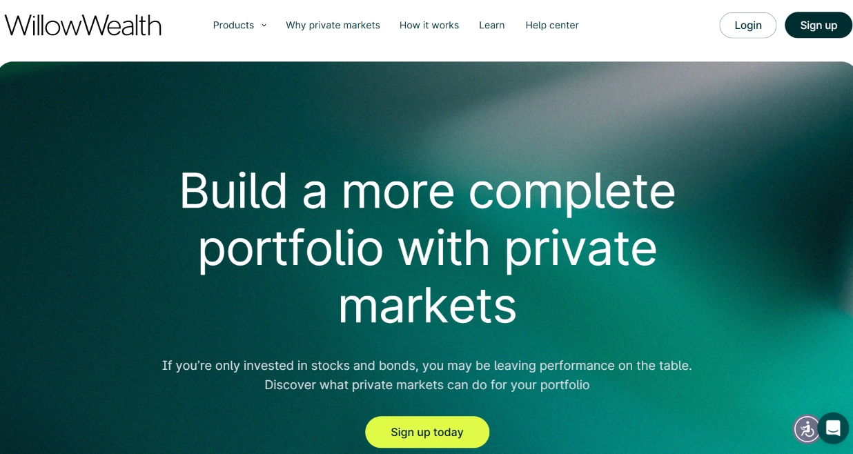 - •PLATFORM-CONFIRMED: Willow 360 managed portfolios launched in partnership with Wilshire Associates; institutional fund partnerships with Carlyle, Goldman Sachs, and StepStone announced (per platform press materials and product pages).
